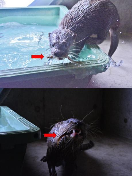 それでも、さすがに三年目だけあってか、慣れた手つきで次々とドジョウをキャッチするカワウソたち。