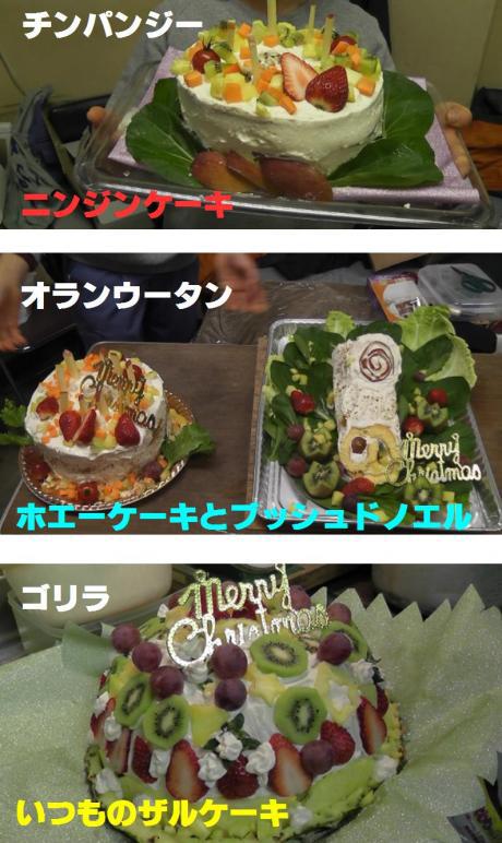 ↓チンパンジーとオランウータンのケーキはスポンジから焼き上げた逸品。砂糖や油をかなり抑えて作ってもらいました。クリームもプレーンヨーグルトと豆腐をミキサーで混ぜて一晩水をきったものを使っています(まるで甘くない)ので、とってもヘルシーなケーキになっています。