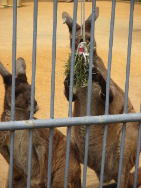 作成後は、カンガルーの運動場に取り付けて、食べるところを観察しました。