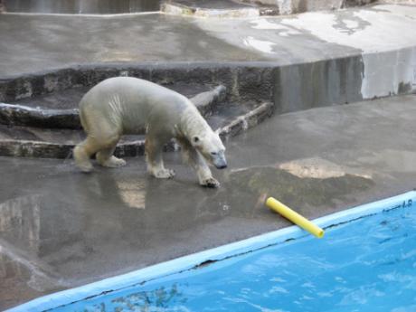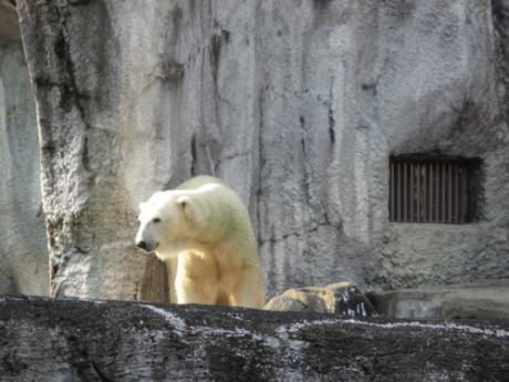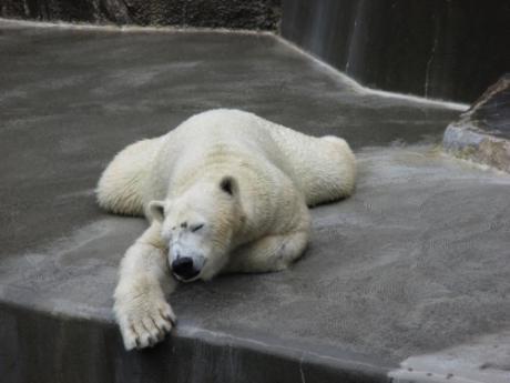 ホッキョクグマは、昼寝をするときに、暑い日には日陰を選んでいましたが、今は日当でも寝ています。