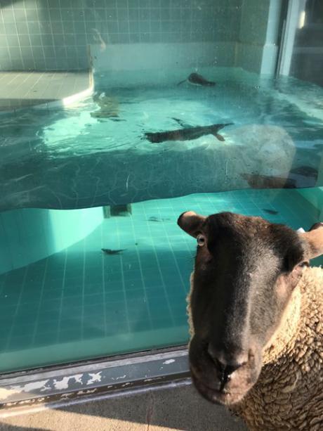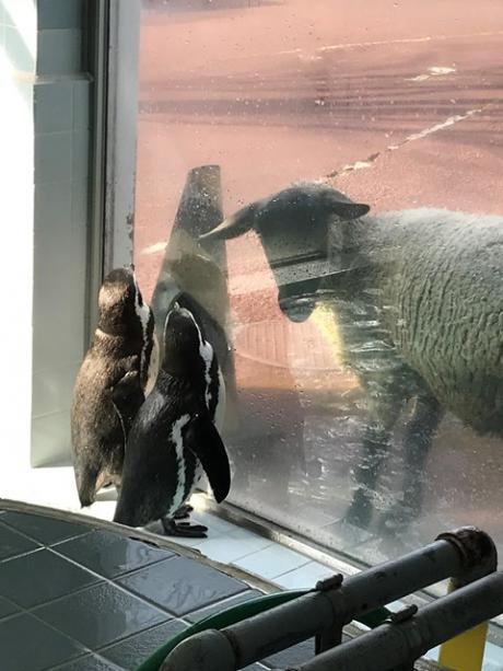 初めて見るペンギンに興味津々なモップ♀(・ω・)