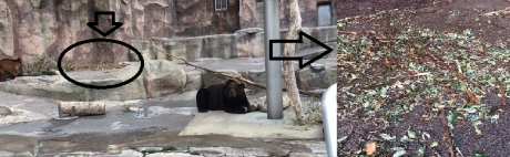 歩き方、ウンチともに異常なし!プールにはピリカよりも多く入っている印象ですね。運動場のシイの葉をたくさんもぐもぐしています。ゴローは我々が様子を見ていると、モート(運動場と園路の間にある堀)の淵まで近づき鼻で匂いを嗅ぎにやってきます。まあ何ももってないと離れていきますが…(笑)