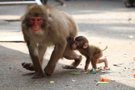 今までは他のサルが近付いてきたら、ピンクは仔を連れて避けていました。