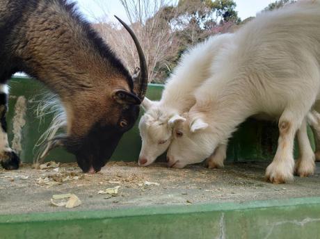 先輩ヤギヒツジがキャベツやペレットに気を取られているすきに