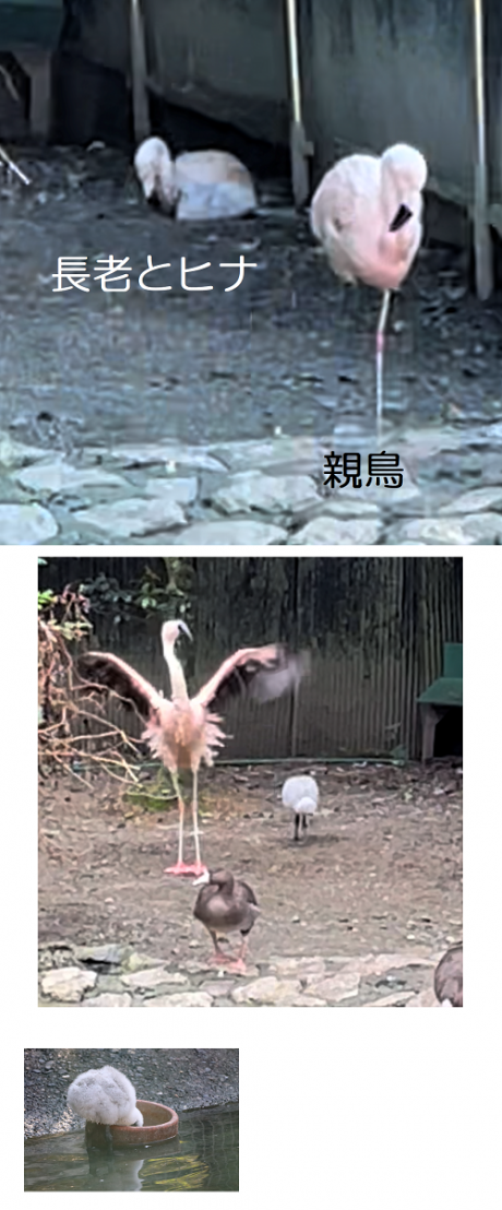 最近、長老(推定58さい以上)のフラミンゴと一緒にいることを多いです。親鳥も容認しているようで怒りません。雛が自ら長老に近寄っている印象です。長老は全然気にせずお世話はしないですが一緒にはいるようです。