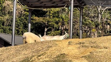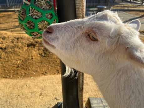 少し離れて観察していると、トカラヤギのアワ♀もフィーダーに近づいてきました!