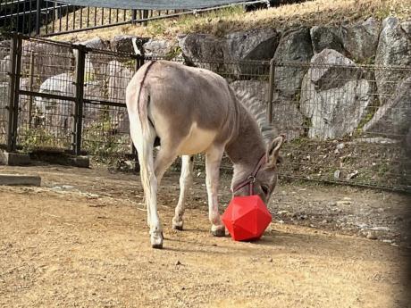 ロバのポテト♂が散歩に行っている間、マロン♀は展示場で留守番をしています。