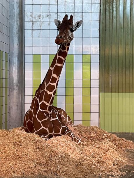最後にふかふかの床でくつろぐキリン(シウン♀)の写真を載せます。すべてはキリンたちの健康のために