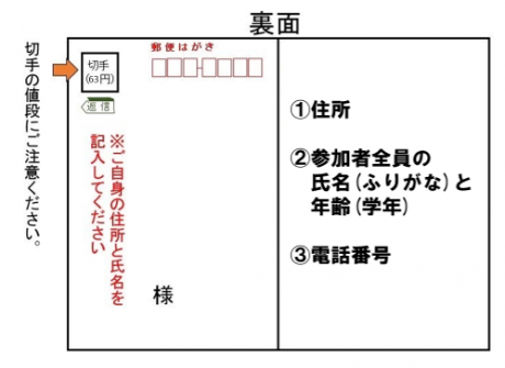 往復はがき(1組につき1枚)に ①住所 ②参加者全員の氏名(ふりがな) と年齢 ③電話番号