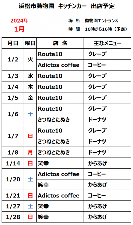 1月のキッチンカー出店スケジュールを掲載します。