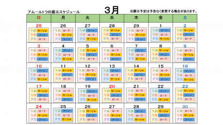 3月のアムールトラの展示スケジュール予定をお知らせします。