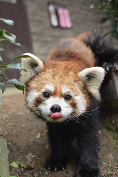 レッサーパンダに、好物の笹の葉をプレゼントします。