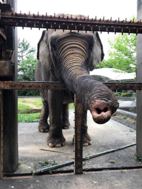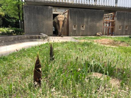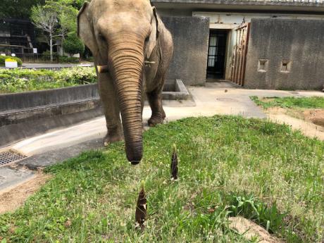 もう終わりも近いですが旬のタケノコがゾウ好みにたいそう伸びてるので、ハマコにあげてますがそれはそれは喜んで食べてます