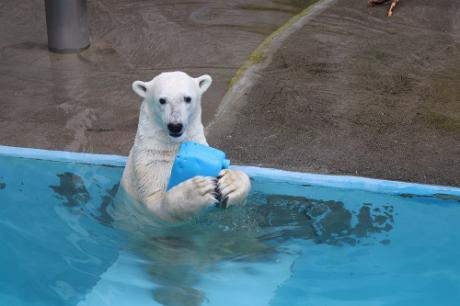 もちろんホッキョクグマの指はポリタンクの口に入るはずもなく、ポリタンクを振ってみたり、落とたりした時の振動で中の魚を取り出します。バフィンが運動場に出ている時間に『ガゴン、ガゴン』という音がするときはきっとこの音です!