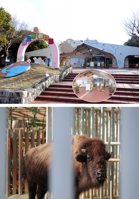 ▽ 浜松市動物園の正門と今年の干支(丑年)バイソンの様子