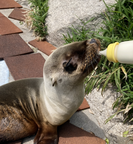 ワラビは生まれて10日で母親のアンコを亡くし、人工哺育(母獣の代わりに人間が育てること)をすることになりました。この1年間の間に、ミルクの飲み方や泳ぎ方などを1から教え、今は離乳のトレーニングに取り組んでいます。