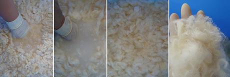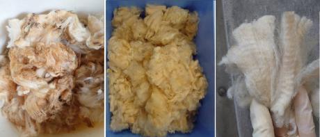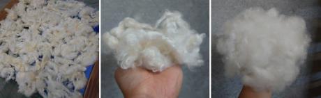 ↑左から日干し・乾燥後の羊毛・ほぐした同量の羊毛