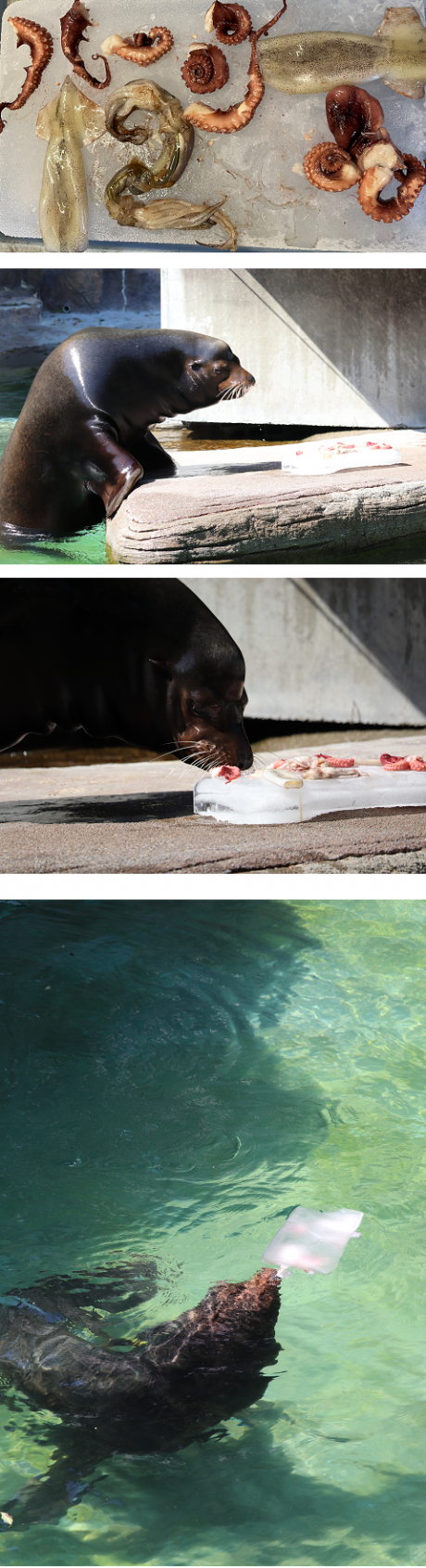 ルーシーはタコを氷の上から引きちぎって食べ、これ以上は凍ってて食べられないと思ったのかプールに落として溶かして食べてました!