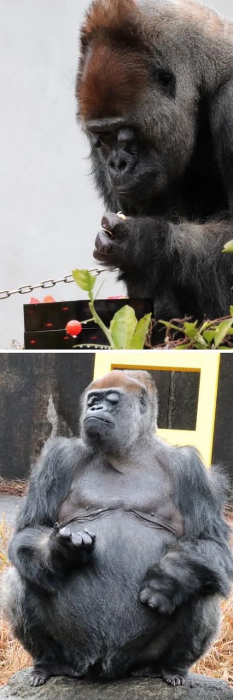 「類人猿にお重でおせちのプレゼント」