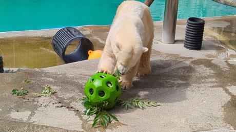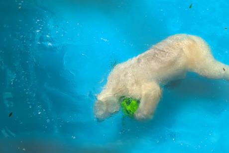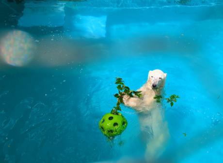 ボールにクリの葉とペレットを入れてあげると、バフィンは葉っぱとペレットを食べてから、ボールをプールまで運び、沈めてみたり、抱えて泳いでいました♪