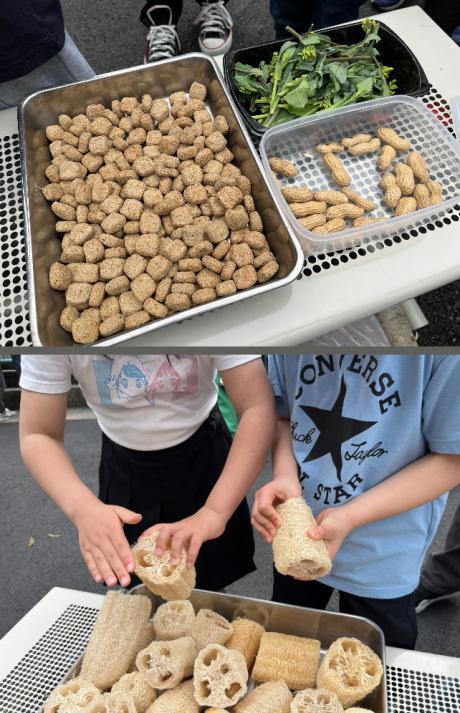 3種類の餌の中から好きなものを1つ選んでもらい、来園者の皆さんにヘチマフィーダーの中に詰めてもらいました!