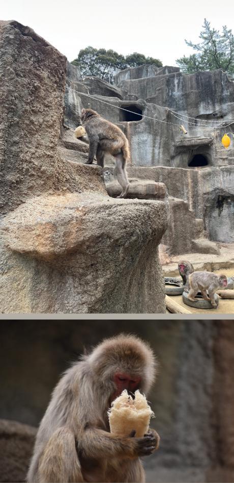 このように、エサの種類や与え方を工夫して、動物が本来持つ「探す・壊す・取り出す」などの行動を引き出す取り組みを『採食エンリッチメント』といい、ニホンザルだけでなく園内のいろいろな動物に行なわれています!