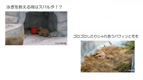 その内容は、最初に簡単にホッキョクグマの出産と子育てについてクイズを交えながらお話し、天王寺動物園でのバフィンの子育ての様子を動画や写真で紹介しました。当時の担当者さんは、バフィンは神経をすり減らしながらも一生懸命子育てしていたと仰っていました。わりと神経質なバフィンの性格もあったかと思いますが、なぜか泳ぎを教える時にはスパルタ?だったそうです!