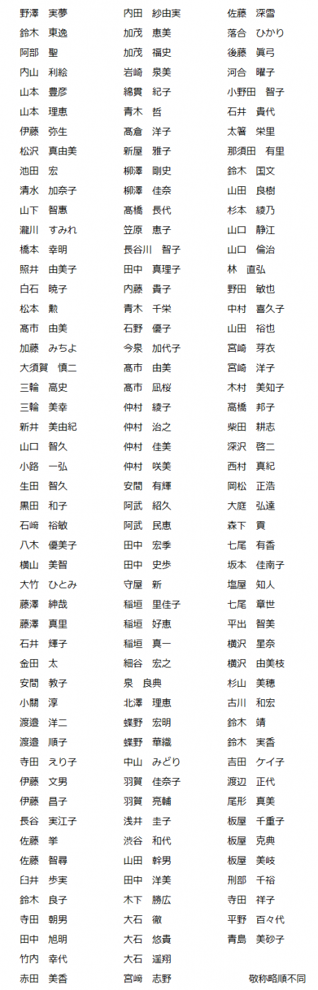 申込書にて、HPへのご芳名掲載可の確認ができたサポーター様のお名前を掲載いたします。