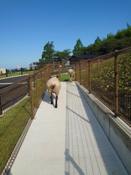 一方、ヒツジ2頭は警戒して坂の下へ…