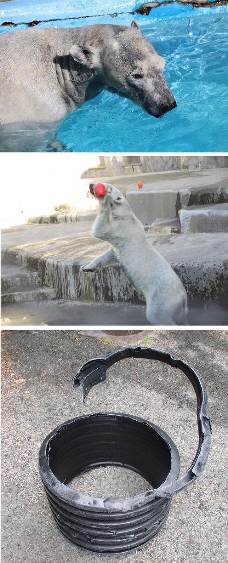 モルタルの匂いは独特で嗅覚の鋭いホッキョクグマはすぐにその補修場所を気になってほじくります。