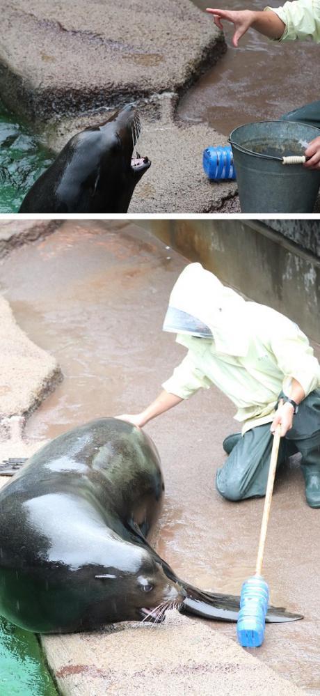 後ろの肢(ヒレ)を出してもらって、採血のトレーニングもしています。アシカはとても大きく力も強いので、トレーニングを行いルーシーにも協力してもらいながら採血できたらなと思っています。
