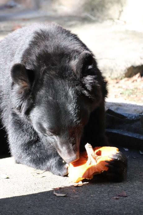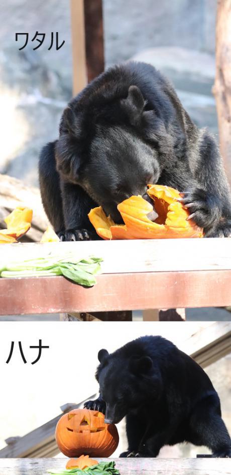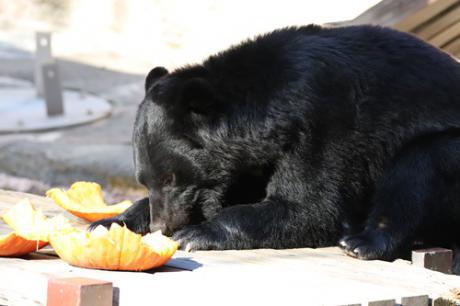 ツキノワグマ運動場ではワタル(♂)とハナ(♀)にカボチャと季節の果物(柿とキウイ)をプレゼントをしましたのでその様子をどうぞ!