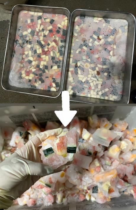 水を入れたバットにスイカ、オレンジ、バナナ、リンゴを入れて一晩凍らせました。
