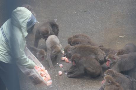 サルたちにあげる時は、1か所にまとめて置くと、強い個体が独占してしまうので、少量ずつ広い範囲に置いていきます。