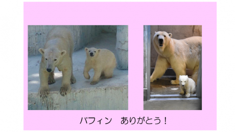 その内容は、最初に簡単にホッキョクグマの出産と子育てについてクイズを交えながらお話し、天王寺動物園でのバフィンの子育ての様子を動画や写真で紹介しました。当時の担当者さんは、バフィンは神経をすり減らしながらも一生懸命子育てしていたと仰っていました。わりと神経質なバフィンの性格もあったかと思いますが、なぜか泳ぎを教える時にはスパルタ?だったそうです!