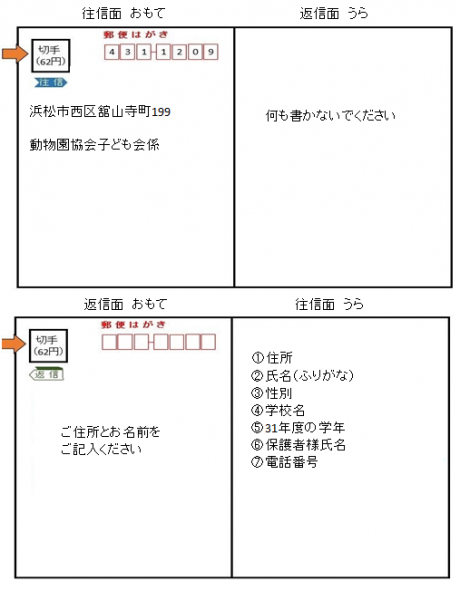 | 申込み方法 | 往復はがきに ①住所 ②氏名(ふりがな) ③性別 ④学校名 ⑤学年(31年度) ⑥保護者名 ⑦電話番号 をご記入のうえ、下記宛先までお送りください。 〒431-1209 浜松市西区舘山寺町199 「動物園協会子ども会係」 |