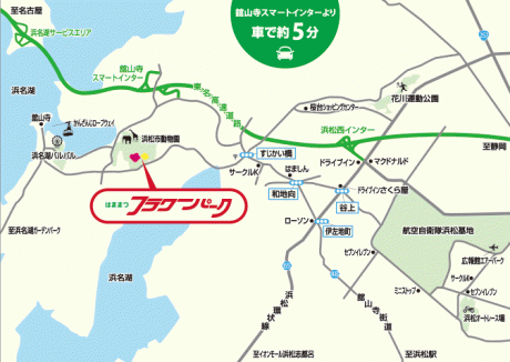 つきましては、お客様の負担が増加してしまいますが、舘山寺スマートインターチェンジをご利用してご来園される方々には、下記の道順において、浜松市フラワーパークへご来園いただき、動物園との共通券(大人760円の内、フラワーパークお買物券300円付)を購入して、共通門を利用して動物園へ入園する利用方法をお奨めいたします。
