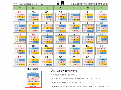 8月のアムールトラの展示スケジュール予定をお知らせします。