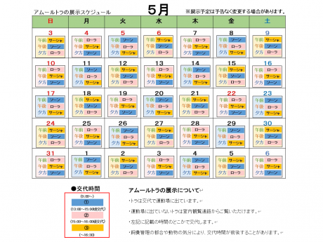 5月のアムールトラの展示スケジュール予定をお知らせします。